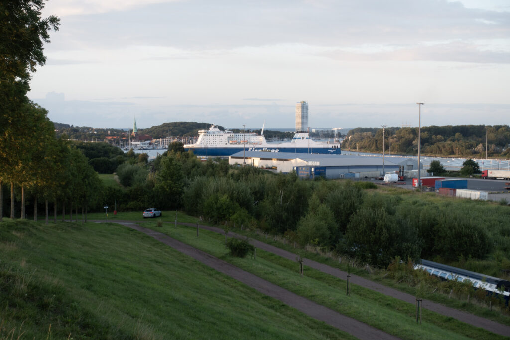 Le dernier train qui nous rapproche de l’embarquement du ferry Finnlines part en direction de Travemünde en soirée. On descend sur le seul quai de la halte de Skandinavienkai, du nom du terminal portuaire. En fait, le port que nous allons rejoindre est conçu avant tout pour les besoins du fret routier, et à la marge pour les voitures. La correspondance depuis le train pour les passagers piétons, si elle ne pose pas de difficulté particulière, fait figure d’exception dans la majorité d’embarquements routiers et logistiques. Aussi depuis la halte ferroviaire, d’où on aperçoit le port derrière des grillages, on compte une quarantaine de minutes de marche sur un chemin. On passe devant un champ de fleurs avec une « caisse automatique » pour les promeneurs qui s’y arrêtent : une tirelire avec les prix des fleurs et même un lien paypal pour régler sa cueillette en libre service, ce qui est courant en Allemagne. En continuant notre chemin vers le port, on arrive ensuite sur un monceau de terre qui offre un point de vue sur notre navire arrivant de sa dernière rotation. Tout au fond, on aperçoit une énorme tour qui est à la fois un hôtel et à son sommet, le plus haut phare maritime d’Europe. Ce trajet à pied, bien que calme et agréable, n’est pas le plus pratique si des valises sont à transporter : on préférera l’un des bus urbains qui relient le train au port.