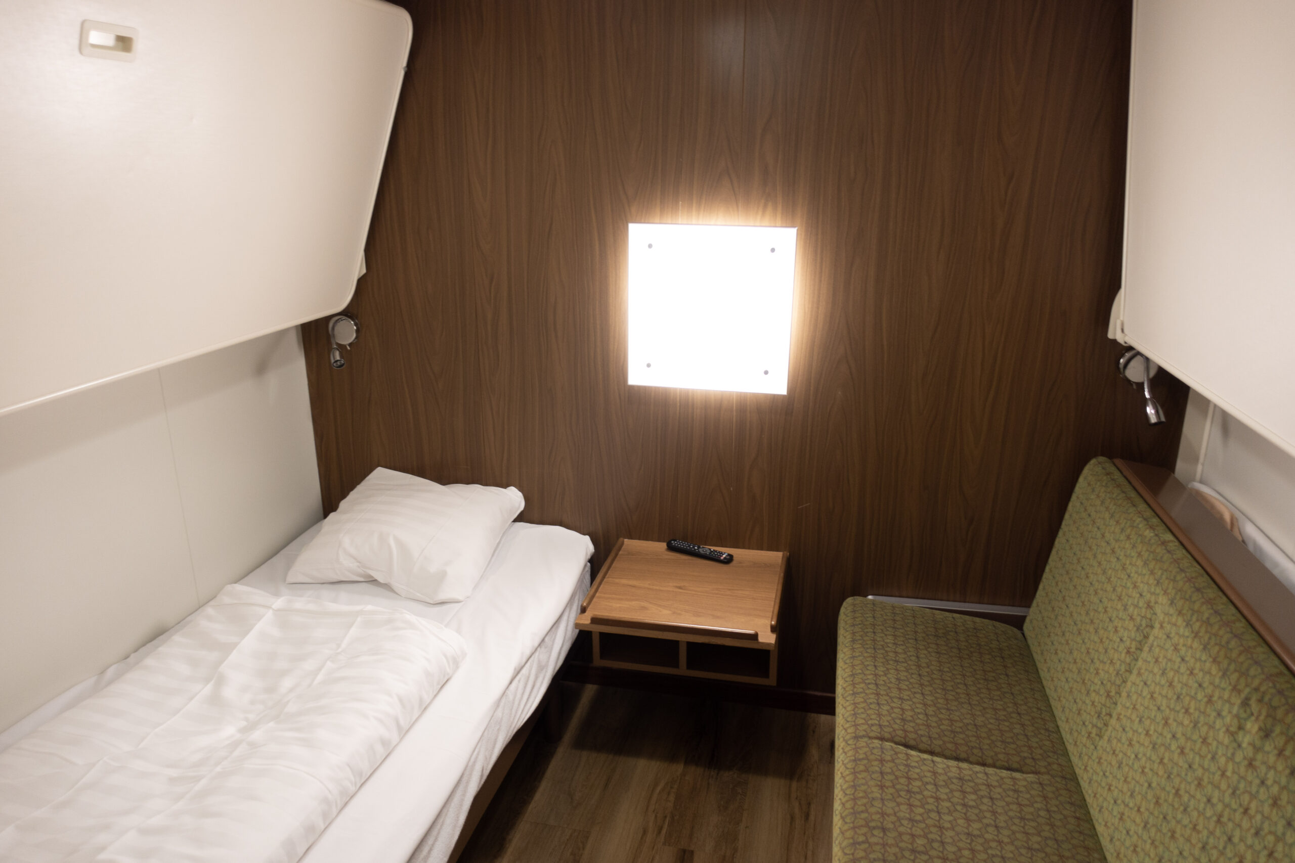 Peu après l’embarquement, on ne tarde pas à regagner sa chambre pour effectuer la première nuit à bord. Au total, le Finnlady peut embarquer jusqu’à 554 passagers, soit autant qu’un TGV « Duplex ». La cabine intérieure de ce ferry construit en 2007 est bien aménagée et comporte des douches/WC privatifs. Pour deux personnes, il s’agit d’une cabine à quatre lits dont la moitié sont repliés, rendant ainsi notre occupation spacieuse.