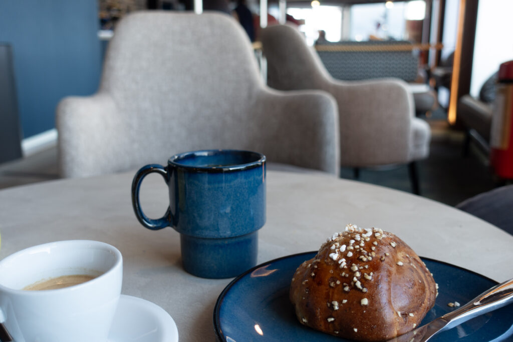 Après cette première nuit, on se réveille en pleine mer baltique. La journée commence par un petit déjeuner dans le café à bord. Une formule permet de payer un premier mug de café filtre puis de repasser le re-remplir à prix réduit, ce mug bleu nous suivra donc tout au long de la journée qui sera rythmée par des allers-retours au café du ferry. Le restaurant à bord, dont les prix sont aussi finlandais, ne sera pas testé : on lui préfèrera des pique niques frugaux achetés sur terre avant d’embarquer, ou des snacks achetés à bord.