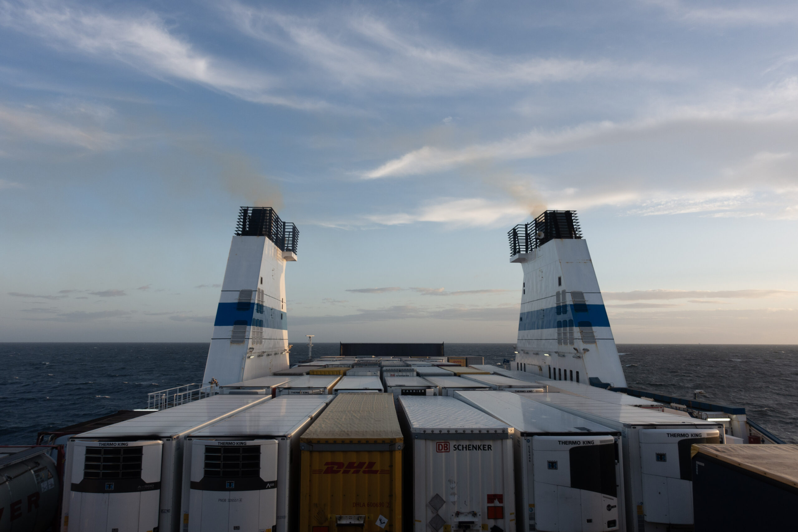 Les cheminées du bateau dont les relents commencent à piquer à la gorge à la fin de la journée et surtout l’étendue des remorques de camions visibles depuis les ponts nous rappellent que nous sommes avant tout dans un ferry « utilitaire ». Le Finnlady est en effet un ferry « Ro-Pax » dans le jargon : les ferries qui transportent essentiellement des camions sont des « Ro-Ro » pour « roll-on/roll-off », tandis qu’un Ro-Pax est tout simplement un Ro-Ro qui prend aussi des passagers. Pour cette traversée mi-août, on croise en effet un nombre significatif de touristes ayant embarqué en voiture, moto, vélo, camping car ou plus rarement à pied. Ceux-ci profitent des installations du bateau et sont d’autant plus nombreux que nous sommes à la veille de la rentrée des classes en Finlande. Mais la raison d’être de cette ligne de ferry qui opère toute l’année, et accoste en Allemagne à une heure bien tardive pour le grand public, c’est avant tout de transporter des cargaisons depuis et vers la Finlande. L’ambiance y est par ailleurs probablement très différente en basse saison. Pendant notre traversée, on croise des routiers à bord, et des espaces leur sont réservés notamment quelques ponts plus bas, avec un « trucker’s lounge ». Ils ne se mélangent pas trop avec les vacanciers, préférant le calme et la praticité des facilités qui leur sont dédiées.