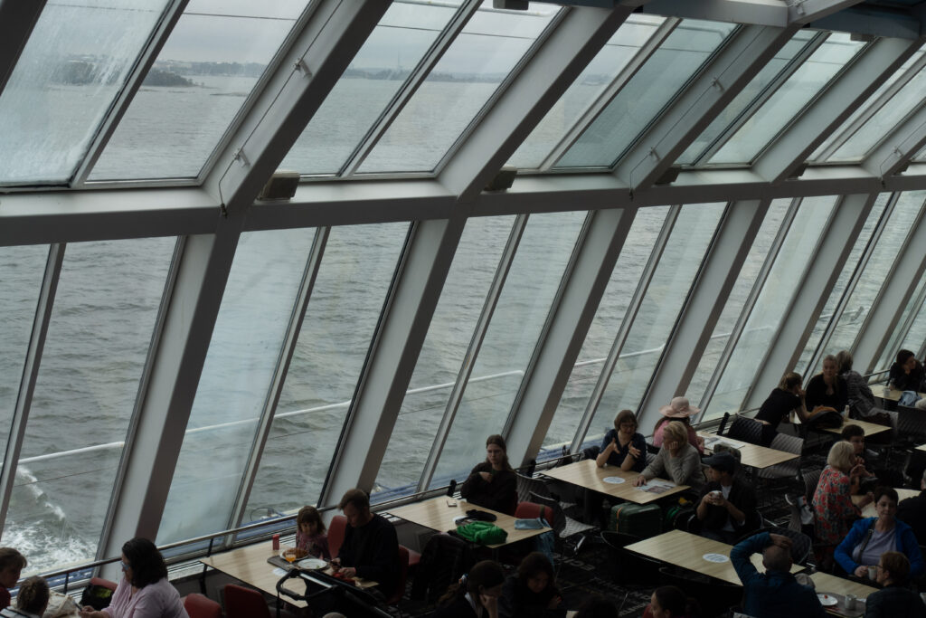 Avec une cabine sans hublot, les occupations à bord se résument principalement à profiter des quelques espaces communs du bateau (salle de sport donnant sur la mer, sauna, boutique, 2 bars et un restaurant). En réalité, le bateau est assez petit, tous ces espaces tenant sur un seul et même pont. Le personnel est aussi réduit, avec un roulement qui consiste par exemple à fermer la boutique souvenirs en fin d’après-midi pour aller débuter le service du bar. Le Finnlady est très bien aménagé et on ne se sent pas à l’étroit. Tout semble assez récent et au design scandinave. Surtout, en été, on profite des ponts extérieurs assez vastes. De nombreuses chaises et transats permettent de se poser longuement entre deux recharges de café. Bien que le trajet se fasse en pleine saison, le navire ne donne pas l’impression d’être plein.