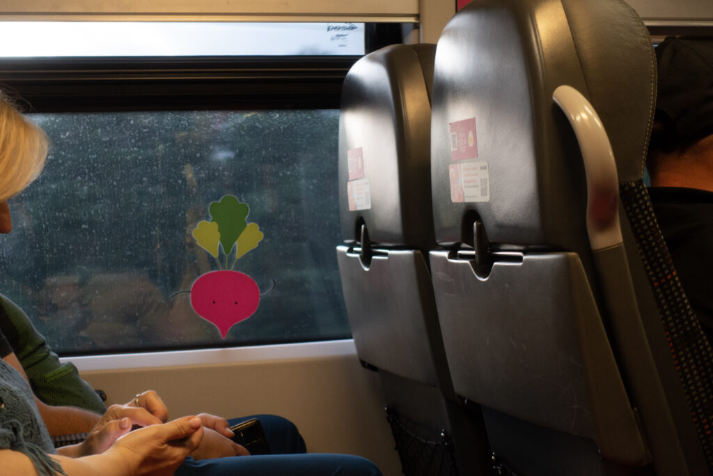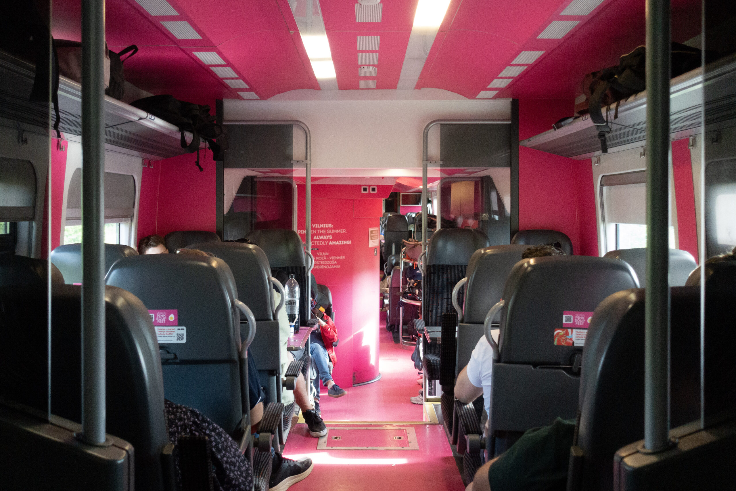 A bord, on découvre l’une des « signatures » des chemins de fer lituaniens : la décoration à thème des intérieurs de train. C’est très bien fait et cela va souvent au-delà d’un simple flocage. En fonction des rames et de la période de l’année, les intérieurs des trains lituaniens sont régulièrement habillés de manière thématique : train de Noël avec des sapins entre les sièges, train de la forêt et faune et flore artificielles… mais ici, nous embarquons dans le train de la soupe rose ! Après les « trains carottes » en Estonie, la voiture centrale de ce train est en effet complètement floquée à l’image d’un plat très populaire dans les pays baltes en été, la soupe froide de betterave et crème à la couleur caractéristique. Du sol au plafond, le train est rose, les tablettes le sont également avec une finition parsemée d’aneth, et les fenêtres sont habillées avec des personnages rappelant les ingrédients de la recette.