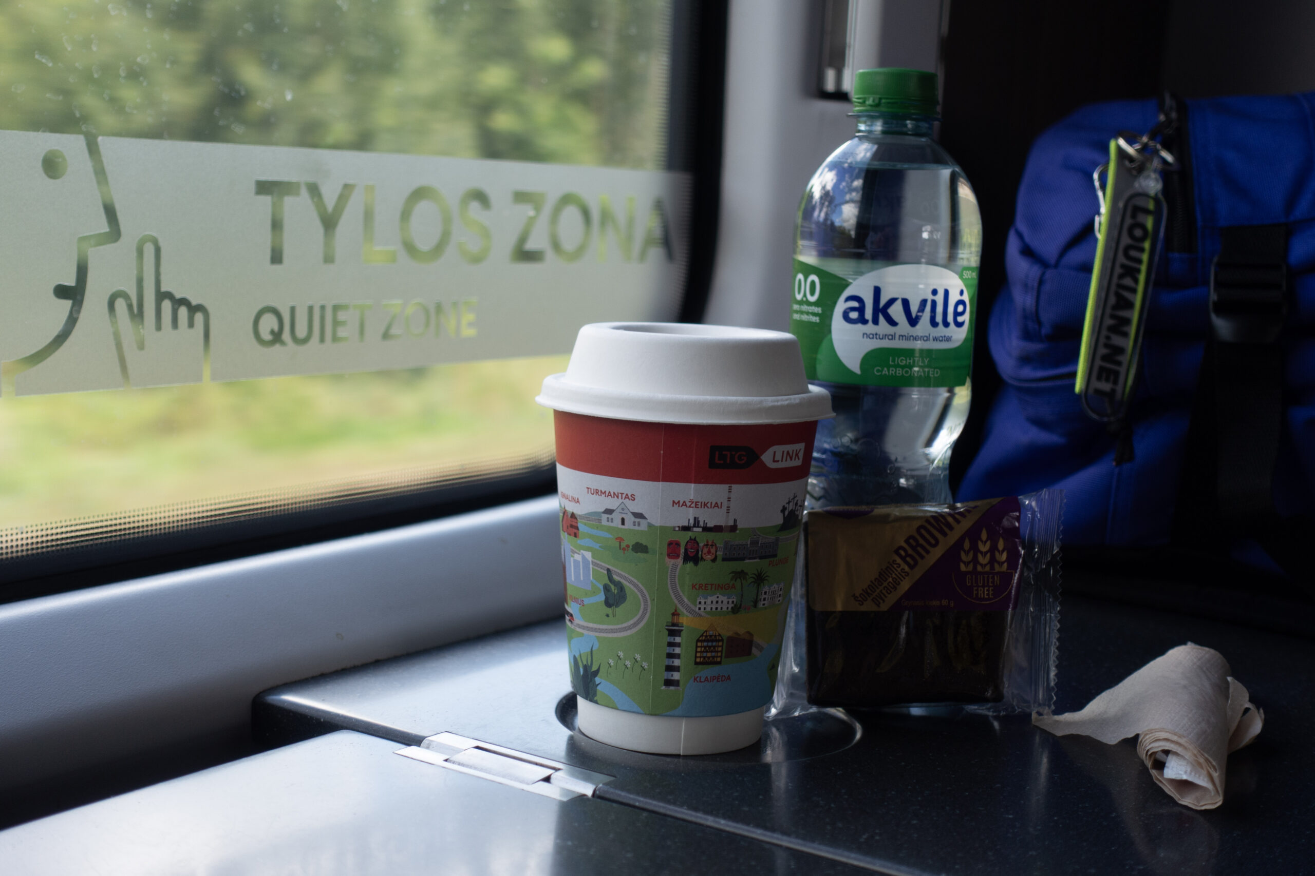 Bien qu’il s’agisse du même modèle de train que la veille entre Riga et Vilnius, on ne retrouve pas de voiture à thème. On effectue également le trajet en première classe : les sièges sont plus confortables, et un snack est offert à bord. En gare de départ, un lounge est en théorie accessible pour les billets première, mais le scan des billets automatique à l’entrée en a décidé autrement ! On traverse la Lituanie d’est en ouest en revenant sur le trajet de la veille puis la ligne vers la côte. Les nombreux arrêts intermédiaires donnent de la vie au train. Le train achemine aussi du courrier interne et du matériel pour les chemins de fer lituaniens. Non loin de nous, on croise deux passagers qu’on retrouvera par la suite dans le ferry vers Kiel.
