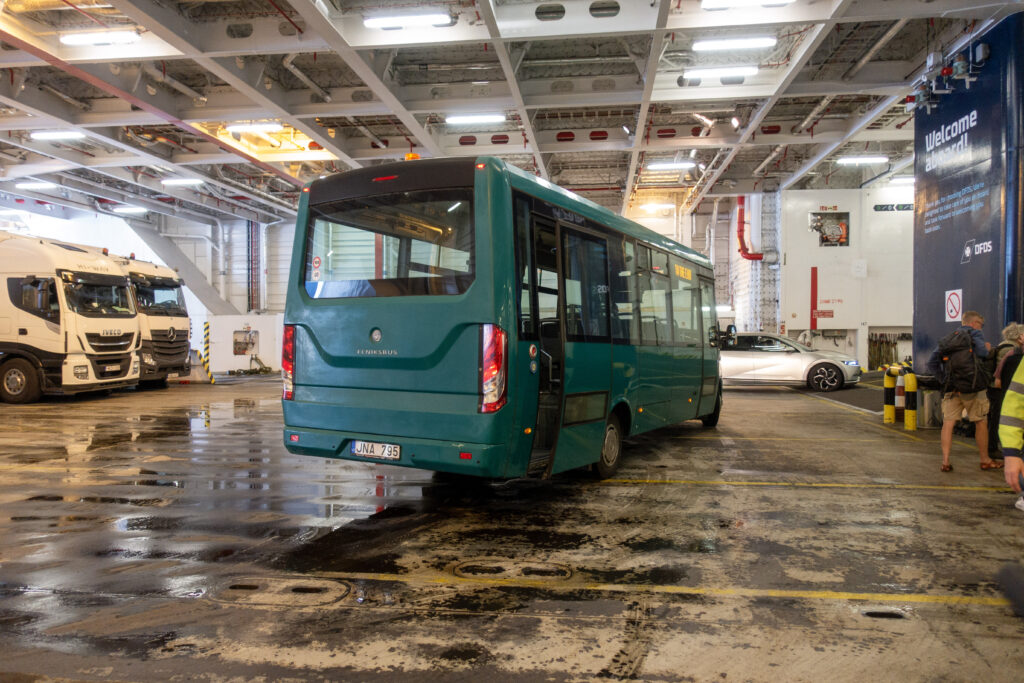 Un minibus amène les passagers piétons depuis le terminal vers la cale du ferry Aura Seaways. On accède, comme à l’aller, aux ponts et à notre cabine par l’ascenseur. On retrouve même dans la cabine en face de nous, nos voisins de train entre Vilnius et Klaipeda.