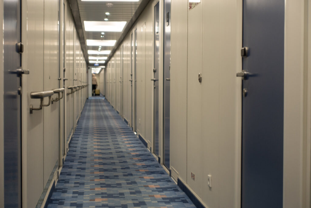 Comparé au Finnlady d’il y a quelques jours, notre navire Aura Seaways est plus moderne et vaste. Construit en 2021, tout y est net, standardisé, on peut par ailleurs perdre ses repères dans les longues allées de cabines qui se ressemblent toutes. L’aménagement est « scandinave », on croirait se balader dans un showroom Ikea.