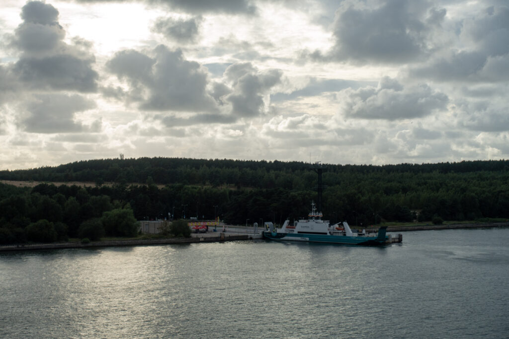Le navire arrive lentement dans la baie de Kiel en Allemagne. Il est préférable de ne pas prévoir de correspondance après son trajet en bateau, ou alors il faut voir large : entre le moment où le bateau accoste et où on arrive vraiment dans la ville, cela peut prendre du temps. Les passagers piétons débarquent dans les derniers, lorsqu’un bus arrive pour les chercher et les ramener au terminal. Une fois qu’on y est, il est possible de rejoindre le centre-ville de Kiel en bus, ou sur un dernier bateau appartenant au réseau de transport urbain.