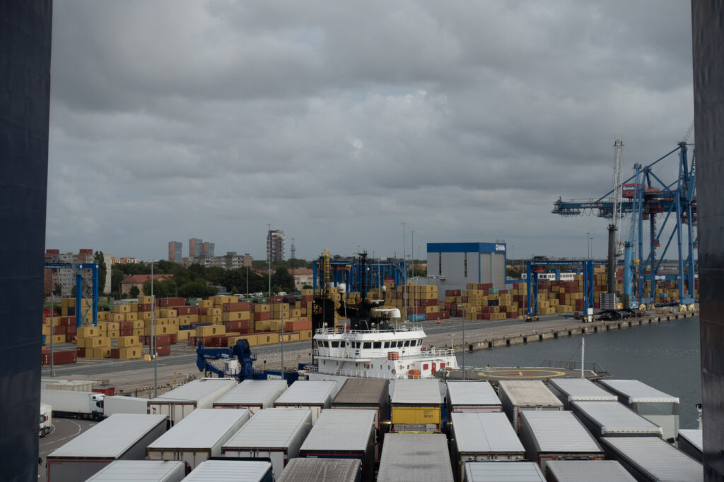 On embarque donc dans le dernier ferry de notre voyage pour retourner en Allemagne, assuré par la compagnie danoise DFDS. Une fois au port, on passe par le circuit dédié aux piétons, où l’on récupère d’abord sa carte d’embarquement et de cabine au terminal passagers avant d’attendre l’embarquement. Comme à l’aller sur le ferry Finnlines, nous sommes dans un « Ro-Pax ». L’essentiel de l’activité est dédiée aux camions, auxquels se greffent les voitures de particuliers, notamment pendant les vacances. Quant aux passagers piétons, ils sont vraiment une exception parmi les exceptions. On se glisse ainsi une nouvelle fois dans les flux logistiques de la mer Baltique pour effectuer notre trajet « atypique ».