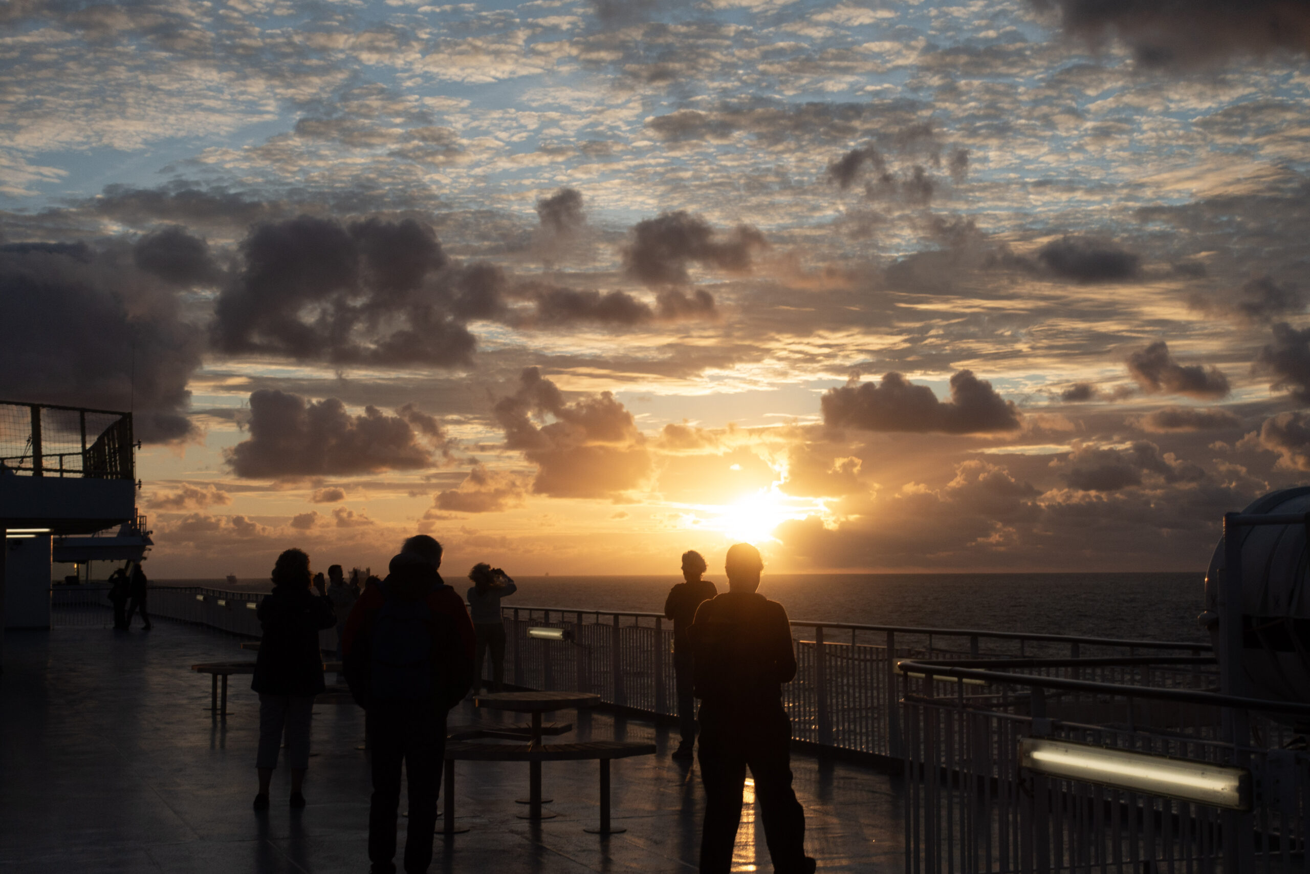 Mais le départ de notre navire de Klaipėda apporte son lot de poésie. Sous un coucher de soleil, 3 navires quittent le port en même temps, dont le Luna Seaways, un navire identique au nôtre qui navigue vers la Suède.
