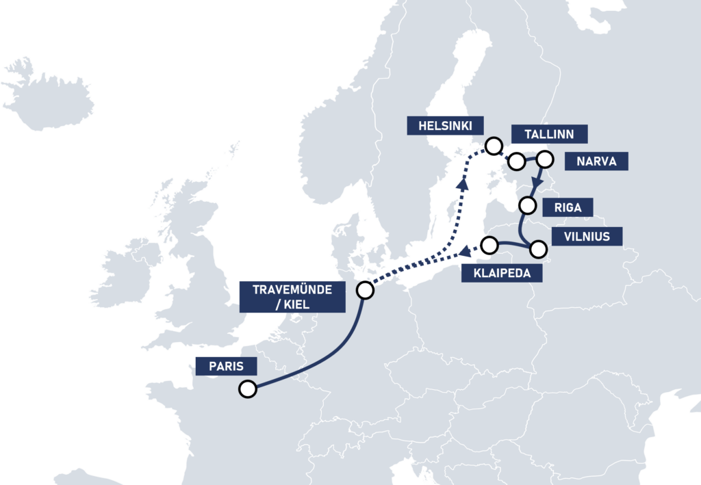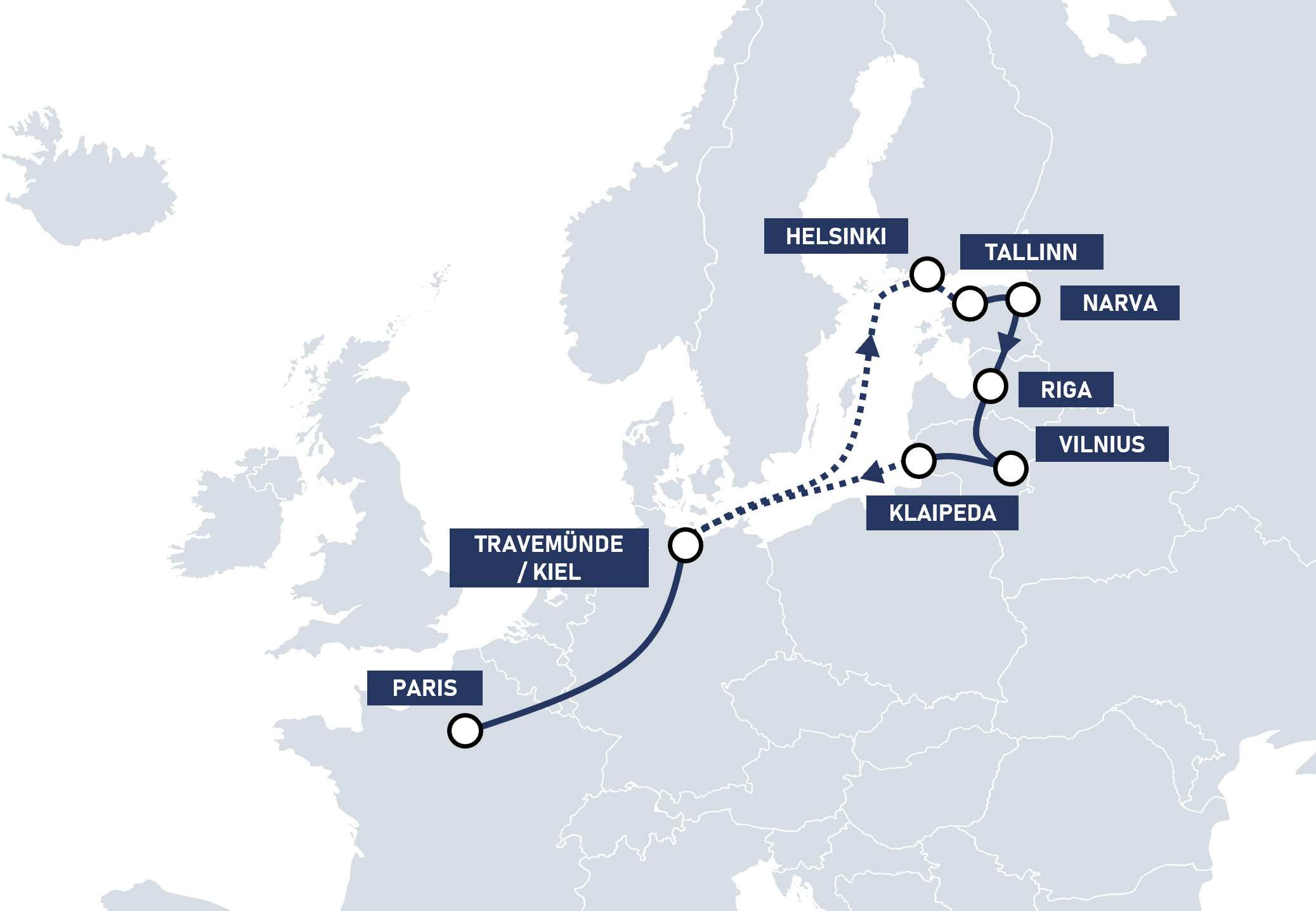 Qu’est-ce qu’une agence de voyage répondrait à un client qui souhaiterait découvrir l’ensemble des pays baltes en 7 jours aller-retour, le tout sans prendre l’avion ? Cela donnerait à peu près ce long parcours à traverser l’Europe d’ouest en est : deux longs trajets en ferry « Ro-Pax » (expression que vous découvrirez dans cet article) feront le pont entre les côtes allemandes et la région balte, qu’on traversera du nord au sud en continu. Un genre unique de « slow travel » à grande vitesse, commençant un mercredi matin à Paris gare de l’Est, et se terminant le mercredi suivant dans cette même gare.